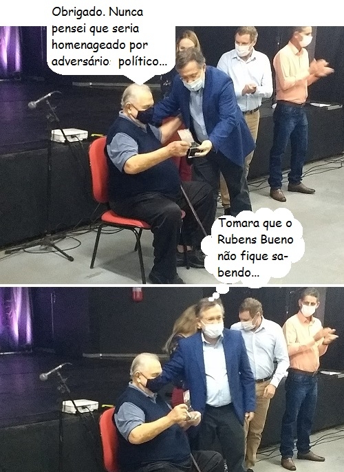 Os cliques são desta quinta-feira, quando o ex-prefeito Augustinho Vecchi foi homenageado nos 40 anos da Casa da Cultura de Campo Mourão. Recebeu placa do prefeito Tauillo Tezelli e tudo. Os dois sempre estiveram em lados políticos contrários. Tauillo começou a vida pública como vice de Rubens Bueno, que sucedeu o último mandato de Vecchi.