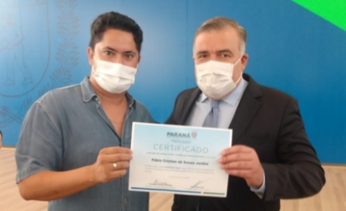 O governo do Estado empossou os 40 novos membros do Conselho Estadual da Juventude. Dois são de Campo Mourão - João Marcos Feitoza (Desenvolvimento Sustentável e Turismo) e Fábio Jardim (Superintendência de Esporte). Na foto, Jardim quando recebeu o certificado do secretário de Estado Ney Leprevost.