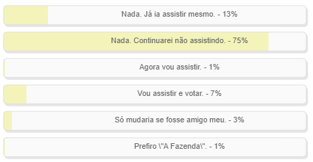 "Naiara Azevedo, de Farol, estar no BBB muda alguma coisa para você?". Enquete com essa pergunta foi encerrada neste domingo. Para 88% dos votantes, não muda nada - 75% por que não já não iria assistir mesmo e 13% porque iria assistir de qualquer jeito. Já 7% disseram que vão "assistir e votar". O resultado completo está no quadro acima.