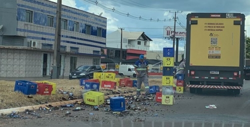 Engradados de cerveja caem de caminhão próximo ao trevo de entrada do Lar Paraná, em Campo Mourão, nesta sexta-feira à tarde.