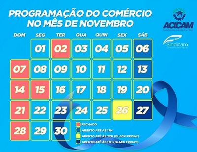 Acicam e Sindicam divulgaram o calendário e os horários especial do comércio para novembro em Campo Mourão. O mês inclui a promoção Black Friday, no dia 26. Neste dia as lojas funcionarão até às 22h. No sábado, 27, o comércio abre até às 17h. As lojas ficarão fechadas no próximo dia 15, feriado da Problamação da República. No sábado anterior, dia 13, no entanto, funcionam até às 17h.