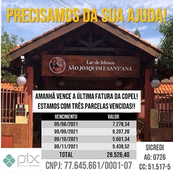 O Lar de Idosos de Campo Mourão está com três contas de luz vencidas. Nesta terça-feira vence a quarta. A dívida soma R$ 28,5 mil. A diretoria do asilo está pedindo ajuda para pagar a conta. Quem quiser (e puder) ajudar pode fazer um depósito no Sicredi ou um Pix. Os números da conta e do CNPJ para o caso do Pix estão acima.