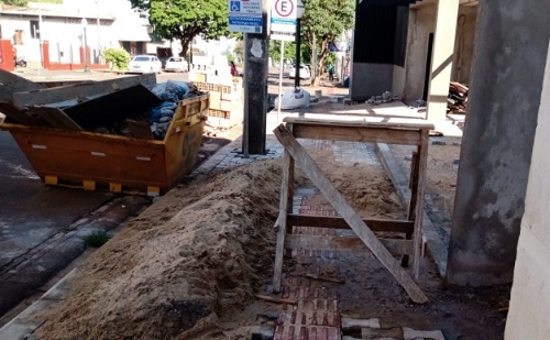 Rua Harrison José Borges, centro de Campo Mourão. Com material de construção e cavalete na calçada, e caçamba no acostamento, resta ao pedestre, literalmente, o meio da rua.