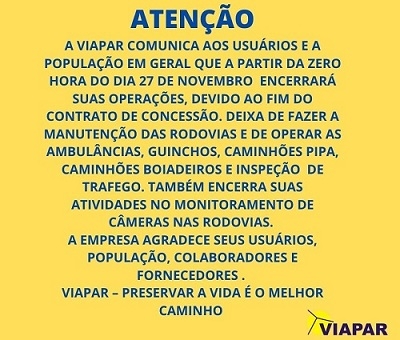 Contagem regressiva: a partir de sábado não tem mais cobrança de pedágio na região. O contrato da Viapar só vale até 23h59 de sexta-feira. Nas redes sociais, a própria concessionária já publica o aviso aos usuários. Destaca os serviços que deixará de prestar, como manutenção de rodovias, guincho, ambulância e monitoramento de câmeras, entre outros. A tarifa básica nas praças da região custa R$ 17,70.