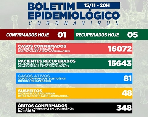 Apenas um caso de covid-19 foi confirmado nesta segunda-feira em Campo Mourão. Os recuperados foram cinco. O número de moradores com o vírus ativo caiu para 81. Na ala covid são oito internações - quatro na enfermaria e quatro na UTI. Somente um internado é de Campo Mourão e está na enfermaria.
