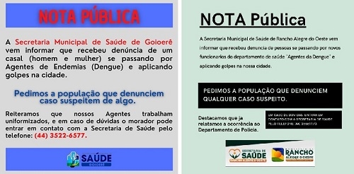 Semana passada foi a prefeitura de Peabiru que divulgou alerta sobre golpe de pessoas se passando por agentes da dengue. Nesta segunda-feira, mais dois municípios fizeram a mesma coisa - Goioerê e Rancho Alegre do Oeste. Moradores devem ficar de olho nos uniformes, na identificação e, em caso de dúvida, denunciar.