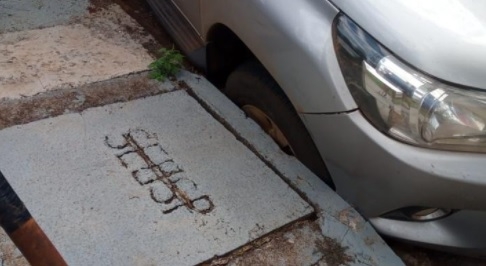 O bueiro foi arrumado há algum tempo, mas não ficou bom. Os ferros estão soltos. Olha o que aconteceu no sábado. Isso é na rua Presbitero José Domingos Santos Filho, no jardim Laura.