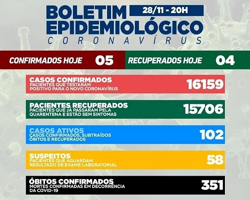 Cinco casos de covid-19 foram confirmados neste domingo em Campo Mourão. Os recuperados foram quatro e o número de casos ativos ficou em 102. Na ala covid dos hospitais são sete as internações, sendo quatro na unidade de terapia intensiva. De Campo Mourão há uma pessoa na enfermaria e outra na UTI.
