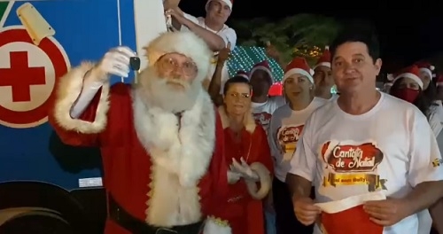 Oclécio Meneses, prefeito de Farol, ao receber das mãos do Papai Noel a chave de uma ambulância para Secretaria Municipal de Saúde. O veículo veio do governo do Estado e, por isso, o agradecimento, em vídeo, foi para o Papai Noel e para o governador Ratinho Jr.