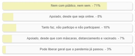 "O que você acha da realização dos eventos de Carnaval em 2022 com público?" Enquete com essa pergunta foi encerrada neste domingo. Não teve nem graça. A alternativa "Nem com público, nem sem" teve 71% dos votos. "Tanto faz. Não participo nem participarei" ficou em segundo, com 10%. Apenas 3% votaram em "Pode liberar geral que a pandemia já passou". O resultado completo está no quadro acima.