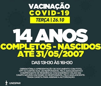 Campo Mourão vai vacinar contra a covid-19, nesta terça-feira, os adolescentes com 14 anos que tenham nascido até 31 de maio de 2007. Será das 13h30 às 16h30, na Unespar. Atenção! Tem de ir acompanhado de um responsável e levar a papelada de praxe - documento com foto e comprovante de endereço, além de levar caneta para assinar a autorização.
