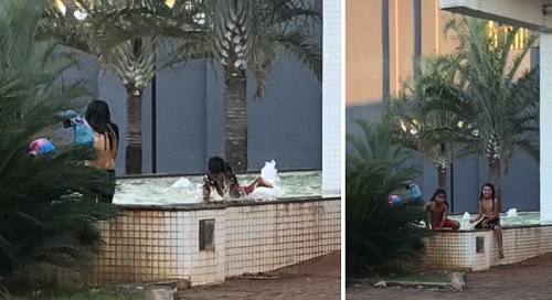 Nesta segunda-feira à tarde, crianças indígenas aproveitaram para tomar banho no chafariz da rodoviária de Campina da Lagoa.