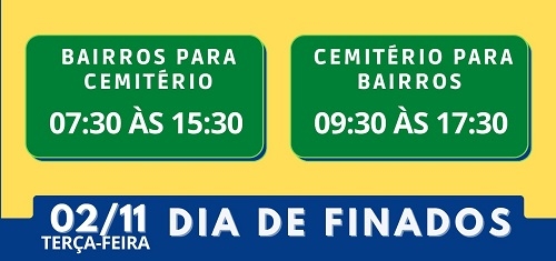 Atenção você que vai pegar o transporte coletivo urbano para ir ao Cemitério Municipal de Campo Mourão nesta terça-feira, Dia de Finados. A Viação Mourãoense informa os horários de funcionamento. Os ônibus vão dos bairros para o cemitério das 7h30 às 15h30. E do cemitério para os bairros das 9h30 às 17h30.