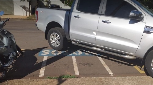 Camionete em vaga de moto em frente à Secretaria de Saúde de Campo Mourão.