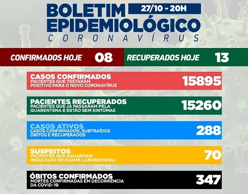 Oito casos de covid-19 foram confirmados nesta quarta-feira em Campo Mourão. Os recuperados foram 13 e o número de mourãoenses com o vírus ativo ficou em 288. O número de casos suspeitos aumentou para 70. Na ala covid, são três pacientes na enfermaria (taxa de ocupação de 15%) e nove na UTI (33% de ocupação no SUS e 10% nos convênios).