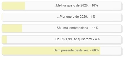 Se dependesse de quem votou na enquete de Boca Santa, o Natal deste ano seria sem presente. O site perguntou como seria o presente e 66% foram na opção "Sem presente desta vez". Em segundo lugar ficou "Melhor que o de 2020", com 16%. Outros 14% foram de "Só uma lembrancinha". O resultado completo está no quadro acima.