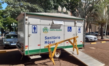 Cavalete que sinaliza impedimento no banheiro móvel, que está na praça Getúlio Vargas.