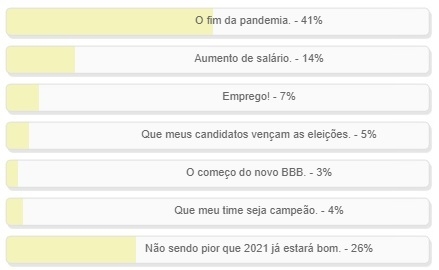 "O que você mais espera do ano novo?" Enquete com essa pergunta foi encerrada neste domingo. Venceu a alternativa "O fim da pandemia". com 41% dos votos. "Não sendo pior que 2021 já estará bom" ficou em segundo, com 26%. Teve ainda 14% para "aumento de salário" e 7% para "emprego". O resultado completo está no quadro acima.