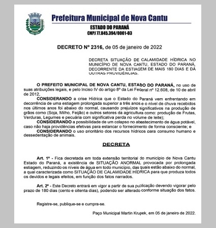 Mais uma prefeitura da região decretou situação de calamidade hídrica.