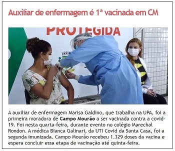 Completou um ano, nesta quinta-feira, que foi iniciada a vacinação contra a covid-19 em Campo Mourão. A auxiliar de enfermagem Marisa Galdino, da UPA, foi a primeira vacinada.