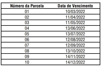 O texto inclui o calendário para quem optar em pagar em 10 vezes (veja acima).