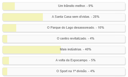 "Se você pudesse, o que daria de presente a Campo Mourão nos seus 76 anos?" Enquete encerrada neste domingo deu vitória à alternativa "Mais indústrias", com 40% dos votos. "Uma Santa Casa sem dívidas" ficou em segudo, com 28%. "O Parque do Lago desassoreado" apareceu em terceiro, com 10%. O resultado completo está no quadro acima.