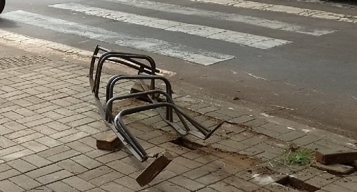 Alguém bateu e retirou do lugar um bicicletário do calçadão de Campo Mourão.