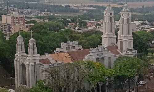 Trabalhadores em ação no telhado da Catedral São José, em Campo Mourão.
