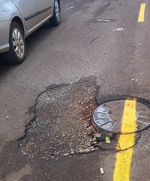 !Esse buraco fica na rua das Tamareiras, no jardim Botânico I. Já tem mais de quatro anos que está assim e mesmo reclamando na prefeitura nunca apareceram pra arrumar, inclusive foi pintado recentemente e mesmo assim não foi reparado".