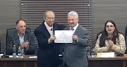 O engenheiro agrônomo Ricardo Calderari recebeu nesta terça-feira o título de Cidadão Benemérito da Lapa, município onde nasceu. A entrega aconteceu em sessão solene de Câmara. A homenagem foi iniciativa do vereador Osvaldo Camargo, aprovada por unanimidade. Entre os presentes, o prefeito de Farol, Oclécio Meneses, o ex-prefeito Gilmar Cardoso, e o deputado Anibelli Neto. Calderari mora em Campo Mourão há mais de 50 anos, onde já recebeu o título de Cidadão Honorário.