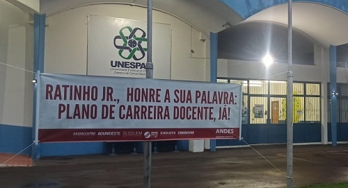Faixa colocada em frente a Unespar de Campo Mourão cobra que o governador Ratinho Jr honre o compromisso com relação ao plano de carreira. Os professores encerraram a greve, mas esperavam a tramitação da matéria, o que ainda não aconteceu. "Ao contrário do compromisso assumido, até o momento, o governo não apresentou oficialmente nenhuma avaliação da proposta", destaca publicação dos sindicatos das universidades estaduais.
