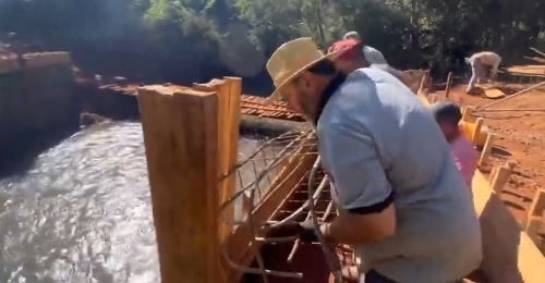 Os prefeitos Airton Agnolin (Nova Cantu) e Vivaldo Lessa (Roncador) se encontraram nas obras da nova ponte do Rio Azul. Equipes dos dois municípios trabalharam na finalização das caixas de madeira, armação e concretagem. Agnolin não resistiu e deu uma mãozinha na hora de se carregar as ferragens.