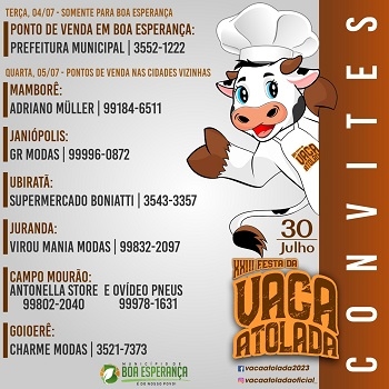 A prefeitura de Boa Esperança liberou nesta terça-feira a venda de convites para a 23ª Festa da Vaca Atolada.