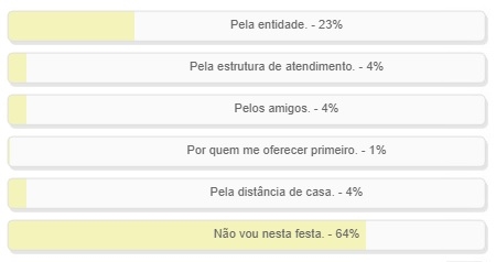 "Como você vai escolher o local para almoçar na Festa do Carneiro no Buraco?" Enquete encerrada neste domingo deu vitória à alternativa "Não vou nesta festa", com 64% dos votos. Normal, afinal o evento é para 5 mil pessoas. Em segundo lugar ficou a opção "Pela entidade", com 23%. Outras três opções empataram na terceira posição, com 4% cada. O resultado completo está no quadro acima.
