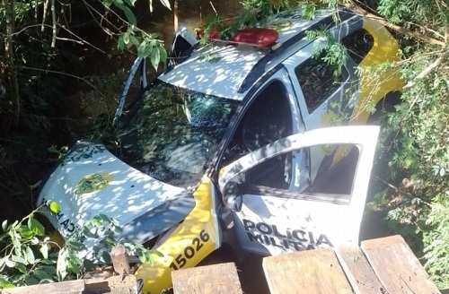 Uma viatura da Polícia Militar de Roncador foi parar dentro de um riacho, durante perseguição a uma moto. Foi na sexta-feira à tarde. Apesar do susto, ninguém se feriu e os estragos no veículo foram de pequena monta.