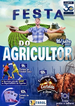 Farol - Acontece neste domingo a Festa do Agricultor. A programação conta com torneio de futebol suíço com sete equipes, torneio de truco, almoço a base de costelão e show. A promoção é da prefeitura.