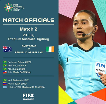 A Fifa anunciou nesta terça-feira os árbitros para a primeira rodada da Copa do Mundo feminina que começa nesta quinta-feira, na Austrália e na Nova Zelândia. E adivinha quem vai apitar logo no primeiro dia, na estreia das australianas (donas da casa) contra a Irlanda? Sim, Édina Alves Batista, de Goioerê. O jogo será em Sydney, às 7h (horário de Brasília). Esta é a segunda Copa do Mundo feminina que Édina trabalha. Ela já esteve na Copa da França, em 2019.