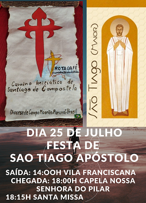 Quem tal fazer, nesta terça-feira, uma caminhada de quatro horas? É o que propóe a Caminhada em honra a São Tiago Apóstulo, no caminho urbano de Campo Mourão, que faz parte do Caminho Iniciátido de São Tiago. Vai sair às 14h da Vila Franciscana e passará por cinco paróquias, até chegar à Capela Nossa Senhora do Pilar, na Vila Carolo. O evento é uma atração das festividades a São Tiago, que se realiza na cidade de Compostela, na Espanha, onde está a sepultura do apóstolo.