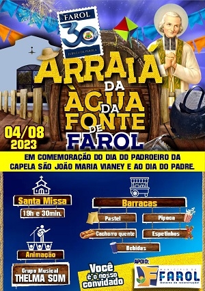 Farol - Acontece nesta sexta-feira (19h30) o Arraiá da Água da Fonte. Começa com missa campal. O objetivo é comemorar o padroeiro da capela local, São João Maria Vianay, e o Dia do Padre. O evento tem o apoio da prefeitura.