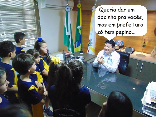 O clic é desta quinta-feira, em Farol, quando alunos do terceiro ano da escola municipal Casimiro de Abreu, acompanhados de professoras, visitaram a prefeitura. Passaram por todos os departamentos e, claro, estiveram com o prefeito Oclécio Meneses. Uma das estudantes, Giovana Liberalli Scbhiavon, entrevistou o prefeito.