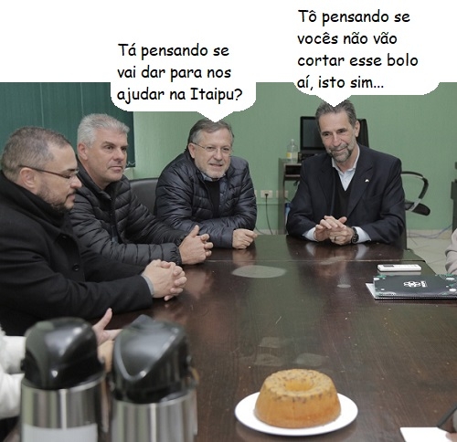 Olha aí mais uma clic da visita do diretor geral brasileiro da Itaipu, Enio Verri, à prefeiura de Campo Mourão. Foi na sexta-feira. Além do visitante, estão na foto o prefeito Tauillo Tezelli e os vereadores Marcio Berbet e Edilson Martins. Além do bolo, é claro...