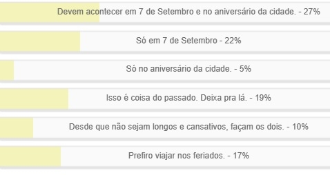 "O que você acha dos desfiles cívicos em Campo Mourão?" Enquete encerrada neste domingo deu vitória à alternativa "Devem acontecer em 7 de setembro e no aniversário da cidade", com 27% dos votos. "Só em 7 de setembro" ficou em segundo, com 22%. Em terceiro ficou "Isso é coisa do passado. Deixa pra lá", com 19%. O resultado completo está no quadro acima.
