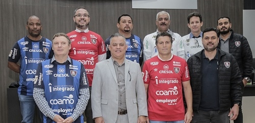 Diretores do Campo Mourão Futsal, a começar pelo presidente Luciano Viana Batista, estiveram nesta segunda-feira na Câmara. Foram recebidos por oito vereadores e falaram a respeito de projeto para o futsal. Na saída, cada vereador recebeu uma camisa do time. E teve pra todo gosto - vermelha (camisa 1), branca (camisa 2) e até azul e preta (terceira camisa).
