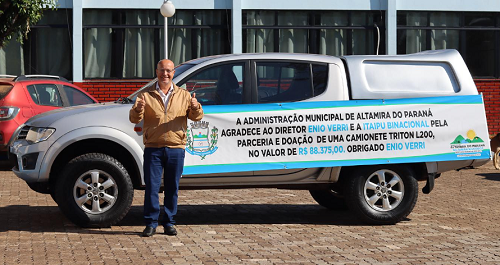 A prefeitura de Nova Cantu não foi a única da região que ganhou uma camionetona usada da Itaipu Binacional, não. Altamira do Paraná também teve a mesma sorte. O prefeito José Etevaldo Branco fez até pose, nesta segunda-feira, ao lado da Mitsubishi L200 Triton. Na faixa colocada no veículo, agradecimentos a diretor da hidrelétrica, Enio Verri. E até o valor de avaliação da camionete: R$ 88.375.