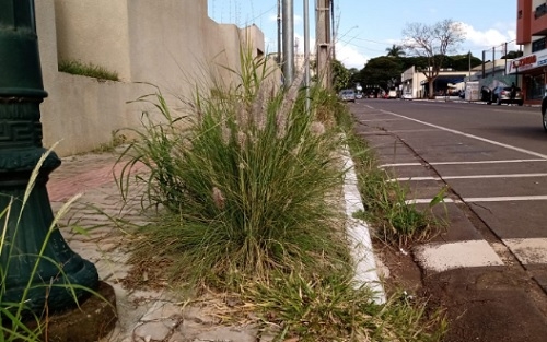 Olha a altura do mato em plena rua Brasil, a uma quadra da prefeitura.