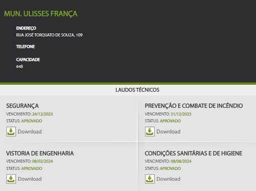 Os laudos de segurança, prevenção e combate de incêndio, vistoria de engenharia e condições sanitárias e de higiene estão aprovados.