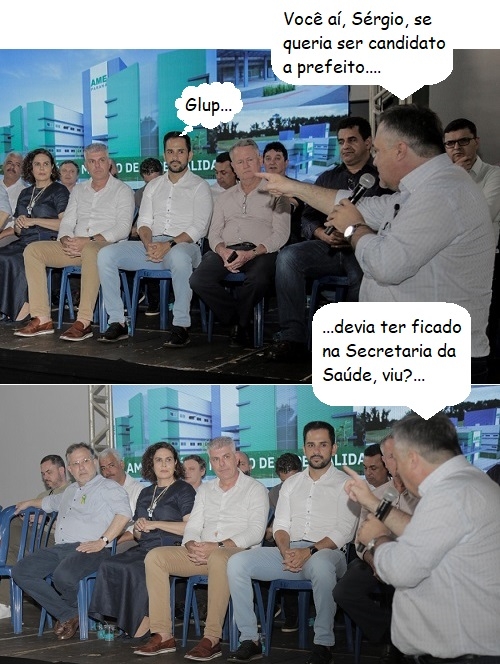 Os cliques são, outra vez, da visita do secretário de Estado da Saúde, Beto Preto, a Campo Mourão. Desta vez ele parece estar apontado para o coordenador geral da prefeitura, Sérgio Henrique dos Santos, que foi secretário municipal da Saúde. O prefeito Tauillo Tezelli, a primiera-dama Hosana Tezelli, o presidente da Câmara Edilson Martins e os prefeitos Ismael Dezanoski (Janiópolis) e Vivaldo Lessa (Roncador) também aparecm nas fotos.