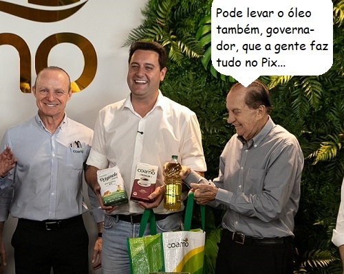 O clic é desta quarta-feira, quando o governador Ratinho Jr esteve em Campo Mourão para entregar a licença de instalação para a indústria de etanol de milho da Coamo. Não saiu sem ganhar uma sacola com produtos da cooperativa. Os presidentes Airton Galinari (executivo) e Aroldo Gallassini (conselho de administração) acompanharam tudo de perto...
