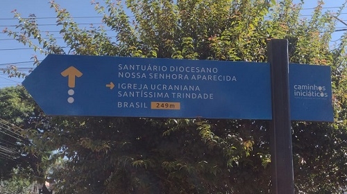 “A placa ficou muito bonita. Está na distância correta (249 metros do Santuário), contudo aponta para o sentido Lar Paraná! E a indicação da Igreja Ucraniana mostra para os lados da Perimetral. Será que eu é que tenho que aprender sobre orientação geográfica? Ou teremos romeiros se perdendo no caminho?”