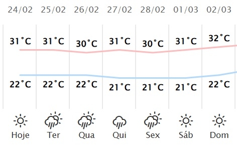Os termômetros vão chegar à casa dos 30 graus todos os dias desta semana em Campo Mourão. A previsão é do Simepar. Começa com máxima de 31 graus nesta segunda-feira e chega aos 32 no domingo. Haverá pancadas de chuva na terça, quarta e sexta. Para quinta a previsão é de 15,8 mm de chuvas e, mesmo assim, a temperatura vaia a 31 graus. Para a semana seguinte a previsão é de calor ainda mais intenso.
